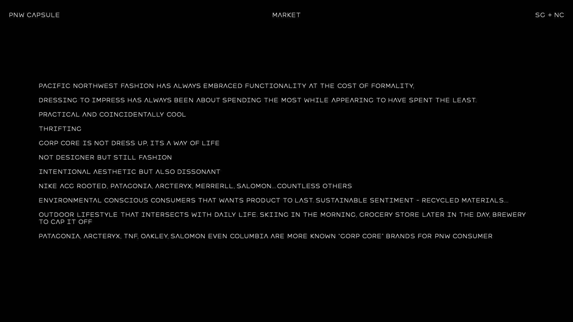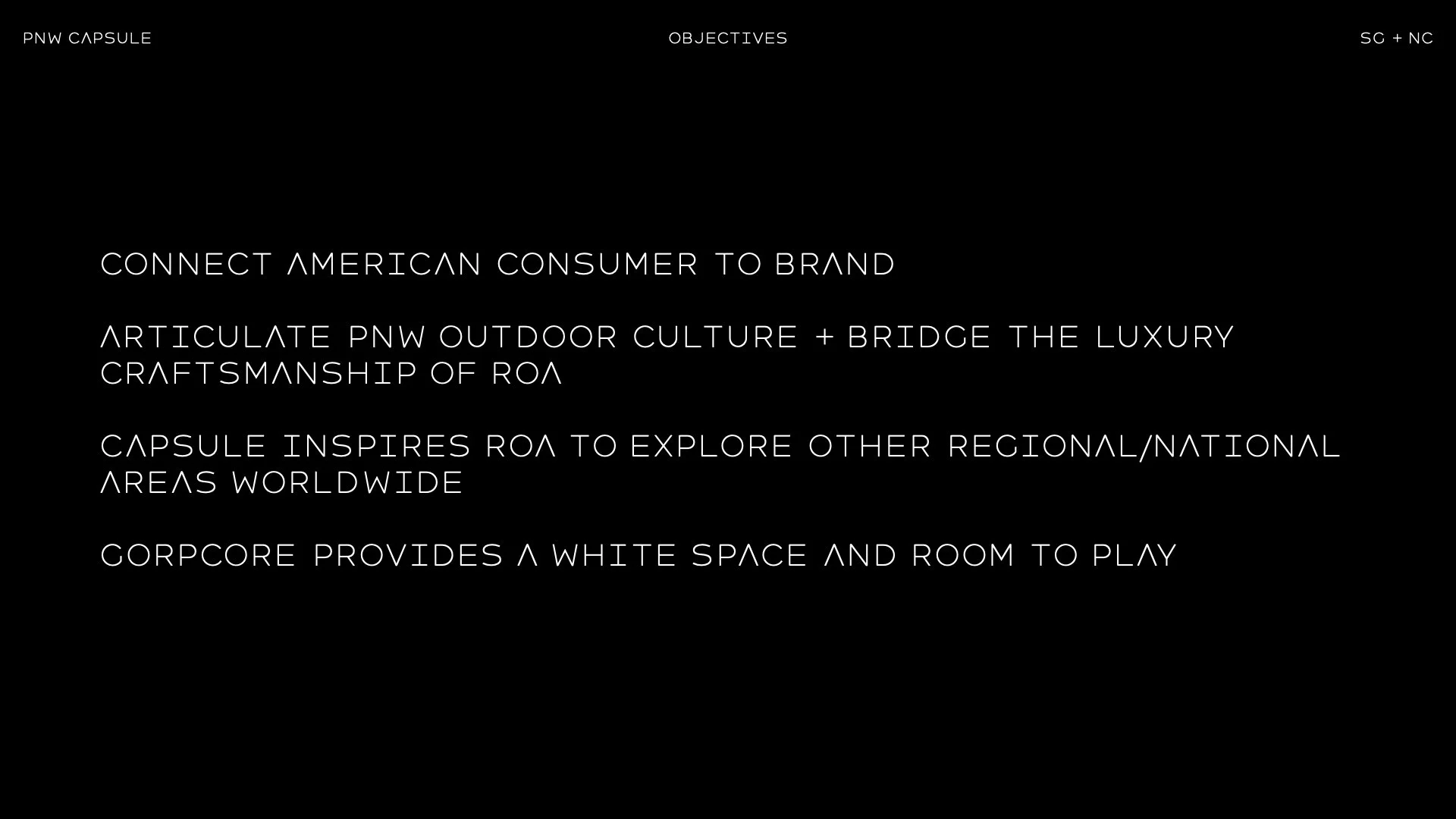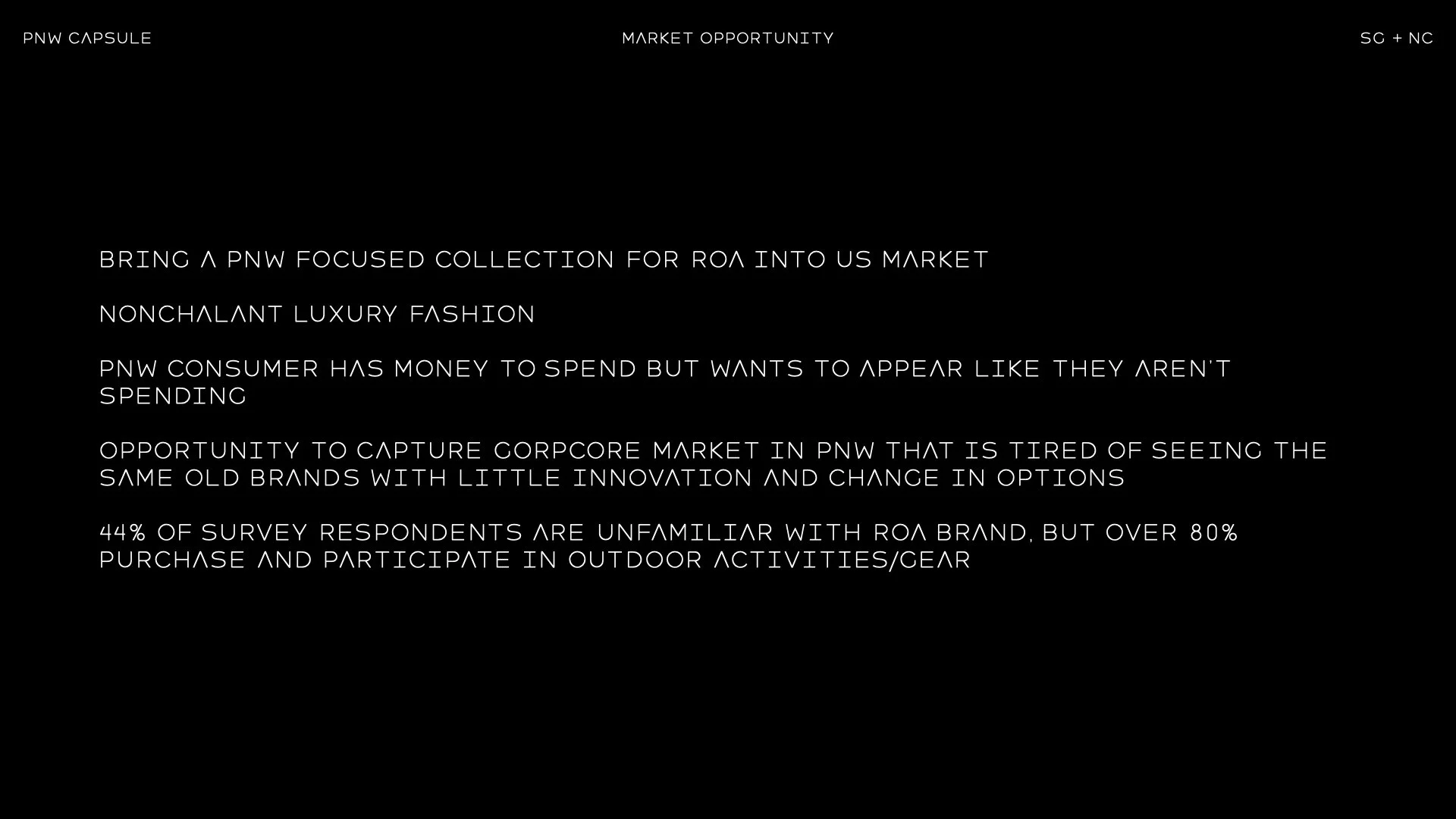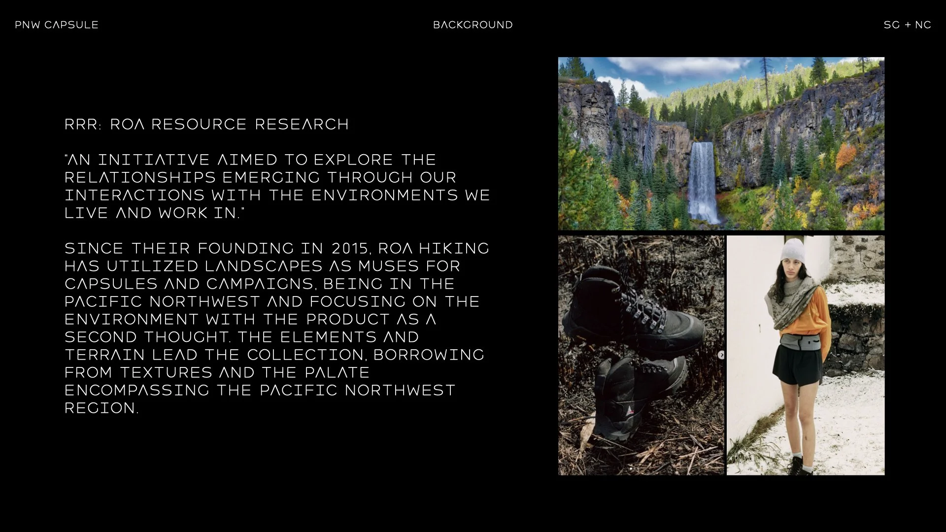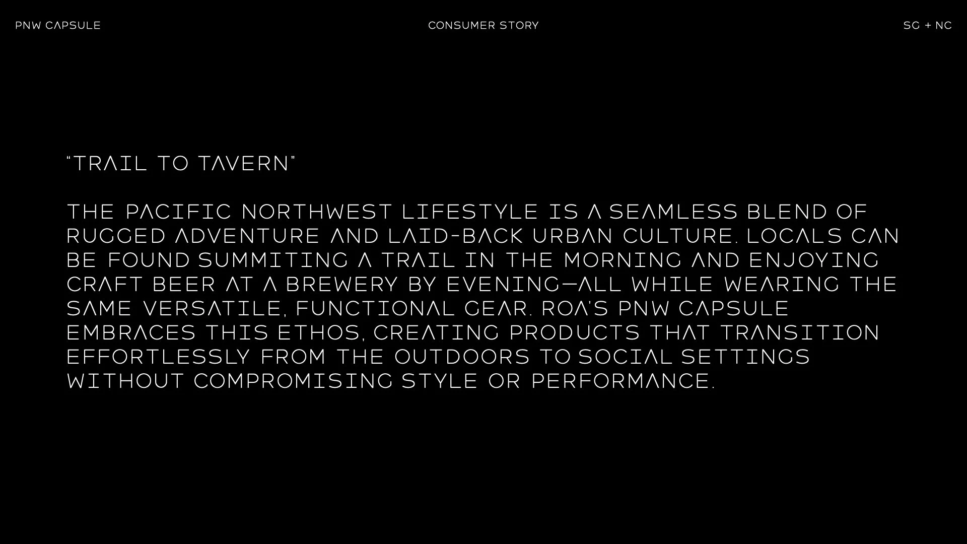 Inspired by one of my favorite brands, I imagined a bold yet natural expansion — not just into a new market, but into a new mindset. The PNW, with its rugged terrain, deep outdoor culture, and design-conscious consumers, felt like the perfect proving ground for ROA’s next chapter.